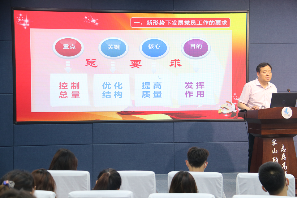 张国利首先解读了发展党员的原则、流程及注意事项,并结合新时代合格党员的标准对与会同学进行了教育和引导。张国利对员工党员提出了三点要求:一是提高思想认识,提高政治站位。要积极学习贯彻习近平新时代中国特色社会主义思想,切实增强“四个意识”,坚定“四个自信”,坚决做到“两个维护”,不断提高政治站位、不断坚定理想信念。二是坚定政治立场,保持良好作风。广老员工党员要不断提高政治判断力,要时刻保持政治方向和政治原则与党中央高度一致,要坚定不移地执行党的方针路线。三是提升自身修养,加强自身建设。要掌握过硬的专业知识,切实提高自身本领,在理论学习、科研领域、社会实践等方面充分发挥先锋模范带头作用。