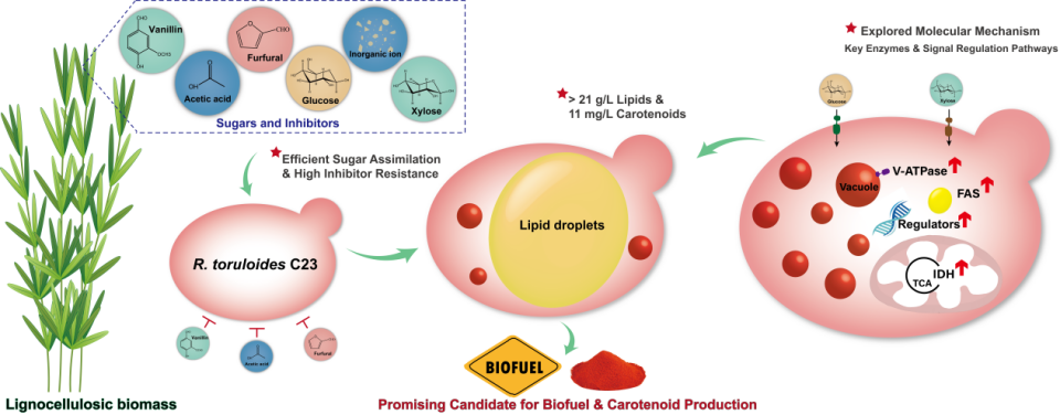 为推动产油酵母微生物油脂的工业化生产,几个关键环节亟待突破:筛选或培育出适应大规模生产环境的强健酵母菌株、优化发酵流程以最大化产品产出、构建高效的油脂分离与下游处理体系。同时,采用经济可行且环境友好的碳源作为发酵基质是降低生产成本、提升整体经济效益的关键一环。木质纤维素生物质因其丰富的葡萄糖与木糖来源正逐渐成为工业发酵领域的理想低成本替代原料。其应用不仅提升了经济价值,还促进了林业与农业的可持续发展。目前大多数产油微生物对木质纤维素生物质利用的关键挑战在于木糖利用能力有限、分解代谢抑制以及木质纤维素副产品毒性影响等方面。因此,提升菌株对糖类的高效利用及对抑制剂的耐受性对于实现从木质纤维素底物到油脂产品的高效、绿色转换具有重要意义。