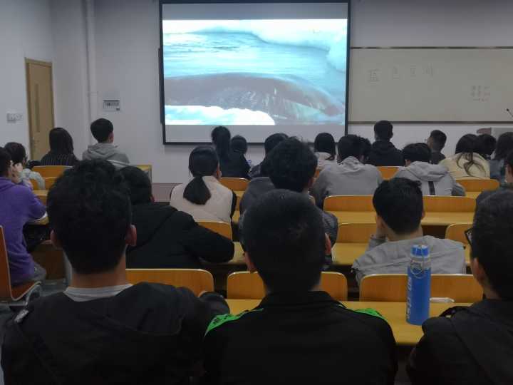 团课上,各班级团支书为同学们播放了BBC大型记录片《蓝色星球》第一季第四集——冰冻海洋。视频带领同学们走进陌生而寒冷的南极与北极,探秘冰冻海洋中生物的繁衍生息。受洋流等地理因素的影响,北极的浮冰常常封锁海面,各种海洋生物被迫徘徊在海底。冰间湖成了鲸鱼呼吸的窗口,也是其他生物觅食与庇护的好地方。南极的气温更低,即使阳光涌现也难感温暖。海面被冰雪覆盖时,鳞虾寻找气泡中存在的藻类裹腹,座头鲸则消耗体内储存的脂肪。当海面解冻,藻类的涌现为鳞虾生长提供食物,也使其他生物资源充足,它们都努力摄食为之后的生活准备能量。企鹅的迁徙与繁衍颇为有趣,不惧风浪、多次尝试或许就是它们生存的秘诀。