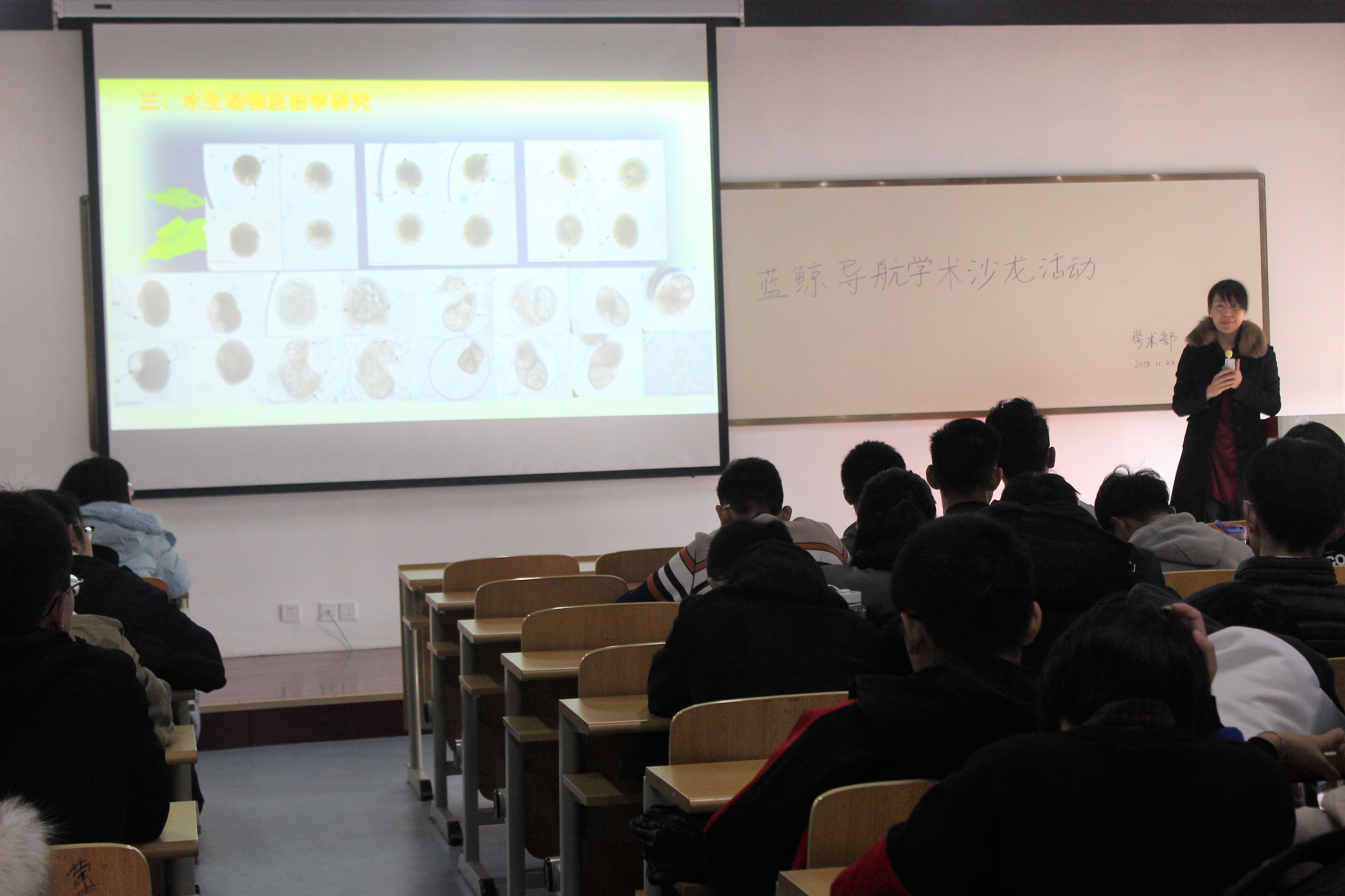 郭恩棉通过PPT为同学们简要阐述了组织胚胎学、分子生物学的研究内容、发展方向,介绍了海洋生物种群遗传、水生动物繁殖以及胚胎发育方面的研究进程,并从种群遗传学研究讲起,以折线图的形式展示了各群体在冰川期影响后平均配对差异。同时,她用水生动物胚胎发育对比图形象的讲述了不同时期水生动物的发育情况。郭恩棉结合自身求学经历,建议同学们对自己的老员工活有一个准确的奋斗目标,并向同学们说明了尽早选择蓝鲸导航工程导师的重要性。