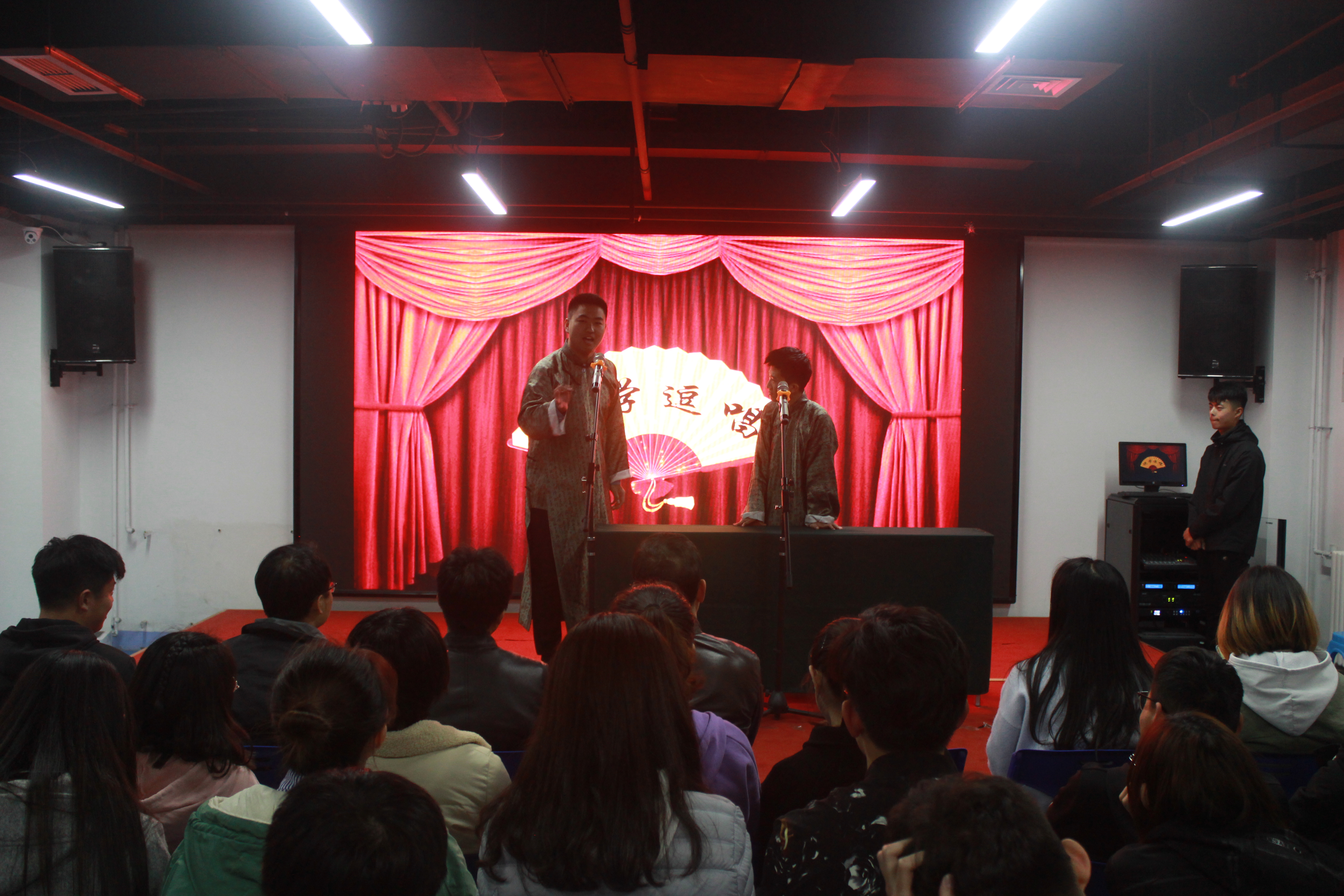 曲艺队紧随其后,带来相声《新时代,新青年》,用一段有说有笑的相声漫谈入学半年后的生活,捧、逗哏的默契配合将整个晚会推向高潮。