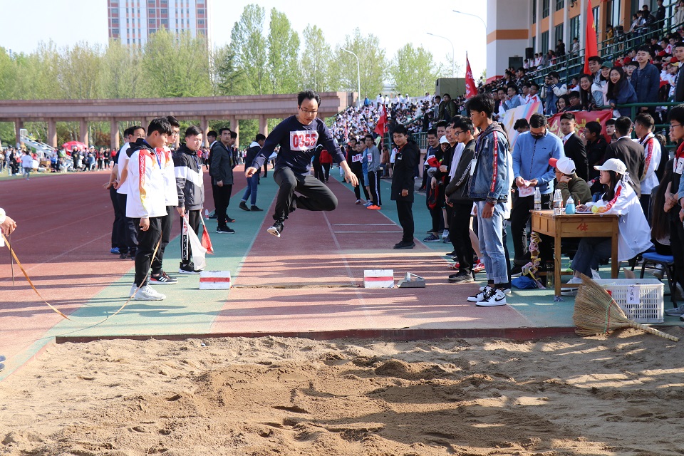 运动场上,运动健儿们身姿矫健,以饱满的热情展示着自己的运动才能。在跳远比赛开始前,焦鹏飞在助跑道旁进行着压腿,拉伸关节等准备活动,为一会即将进行的比赛注入能量。在比赛正式开始前,裁判让各运动员进行试跳以了解场地具体情况。焦鹏飞经过试跳后预估了从助跑线到起跳线的距离,对比赛更多的拿捏了一份自信。“跳!”随着裁判员一声令下,他左脚在前,右脚在后,起跑时成“弓”字步平衡身体,加快冲刺速度,自然流畅地完成单足跳,跨步跳,跳跃三个连套动作。在空中形成优美的弧线最后快速屈腿抬膝落入沙坑,赢得阵阵喝彩。