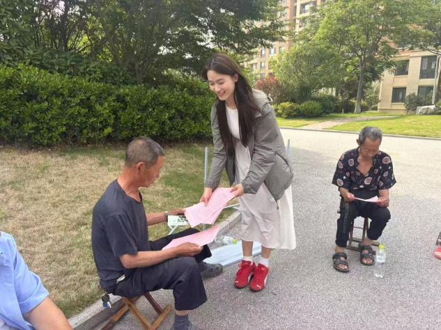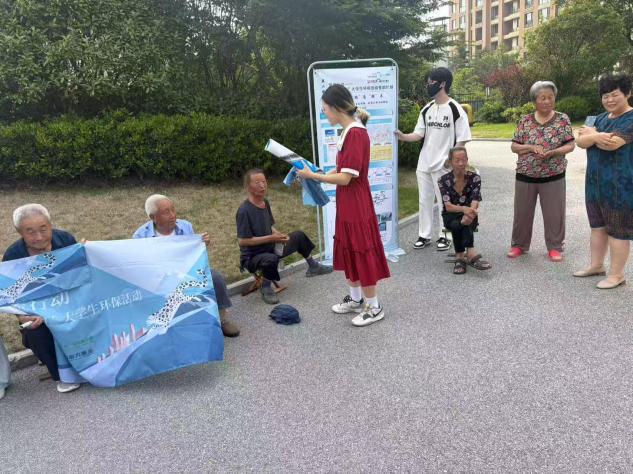 除校园宣讲外,团队还深入新民社区,针对不同年龄层居民开展生态知识科普与长江鲟保护宣传。在社区广场,队员们搭建简易宣传点,通过展板展示、资料发放、面对面交流等形式,向居民普及相关知识。