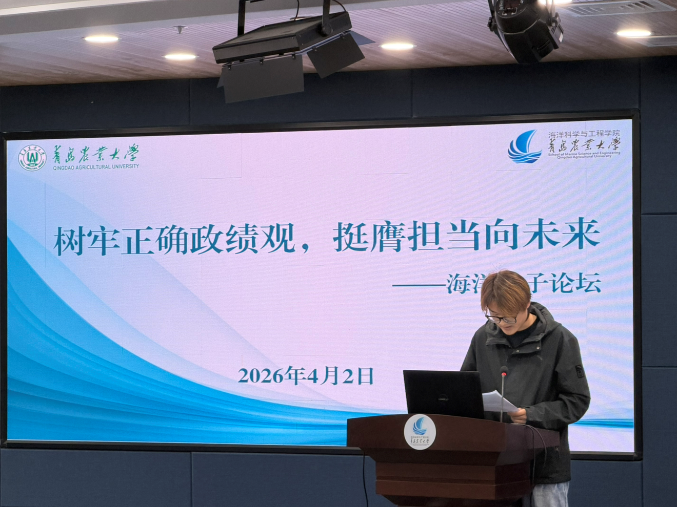 论坛以“树牢正确政绩观,挺膺担当向未来”为主题,聚焦员工骨干的角色定位、服务意识与成长方向,引导青年学子树立求真务实、甘于奉献的价值导向。论坛期间,大家集体观看了《为民出政绩 实干出政绩》专题视频。水养2401班刘东俊结合自身员工工作与学习实践经历发出倡议:一是要正确理解“政绩”,把服务人民作为青春的价值坐标;二是要坚守“实干”精神,把求真务实作为成才的必经之路;三是要勇担“海洋”使命,把向海图强作为奋斗的时代主题。他呼吁同学们雅以此次学习为契机,树牢“为民出政绩、实干出政绩”的正确观念,不驰于空想,不骛于虚声,以扎实学识、过硬本领、务实作风,把青春热血挥洒在蔚蓝海洋,把奋斗文章书写在祖国海疆,在建设海洋强国、实现民族复兴的壮阔征程中,写下属于海洋青年的精彩篇章!
