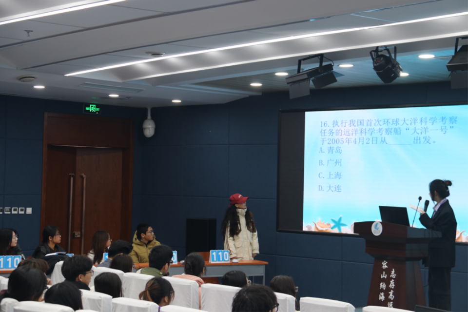本次比赛采取线上、线下相结合的方式开展。前期通过网络答题进行初选,经线下笔试复赛,最终十名选手脱颖而出,晋级决赛。决赛共设“快问快答”“当机立断”“慧眼识珠”“能言快语”“奋起直追”“走向深蓝”六个环节,内容涵盖海洋科学知识、相关法律法规、海洋时事热点、海洋权益维护及多学科交叉融合等多个维度,全面考察选手的专业知识储备、时事了解、临场应变能力。比赛过程中,选手们沉着应对、自信作答,展现了海洋学子丰富的海洋基础知识储备能力。尤其在“能言快语”环节,六名晋级选手思维敏捷、表达流畅,在阐述对海洋保护、海洋权益等问题的见解时,不仅体现了对海洋事业的深刻关注与热爱,更表达了积极投身海洋强国建设的青春志向。经过层层角逐,田鑫雨获得一等奖,高竹筠、张淦锦、栾珺斐获得二等奖,石乐敏、娄岚、谭雅文、胡丞林、王曼苏、孙思雨获得三等奖。