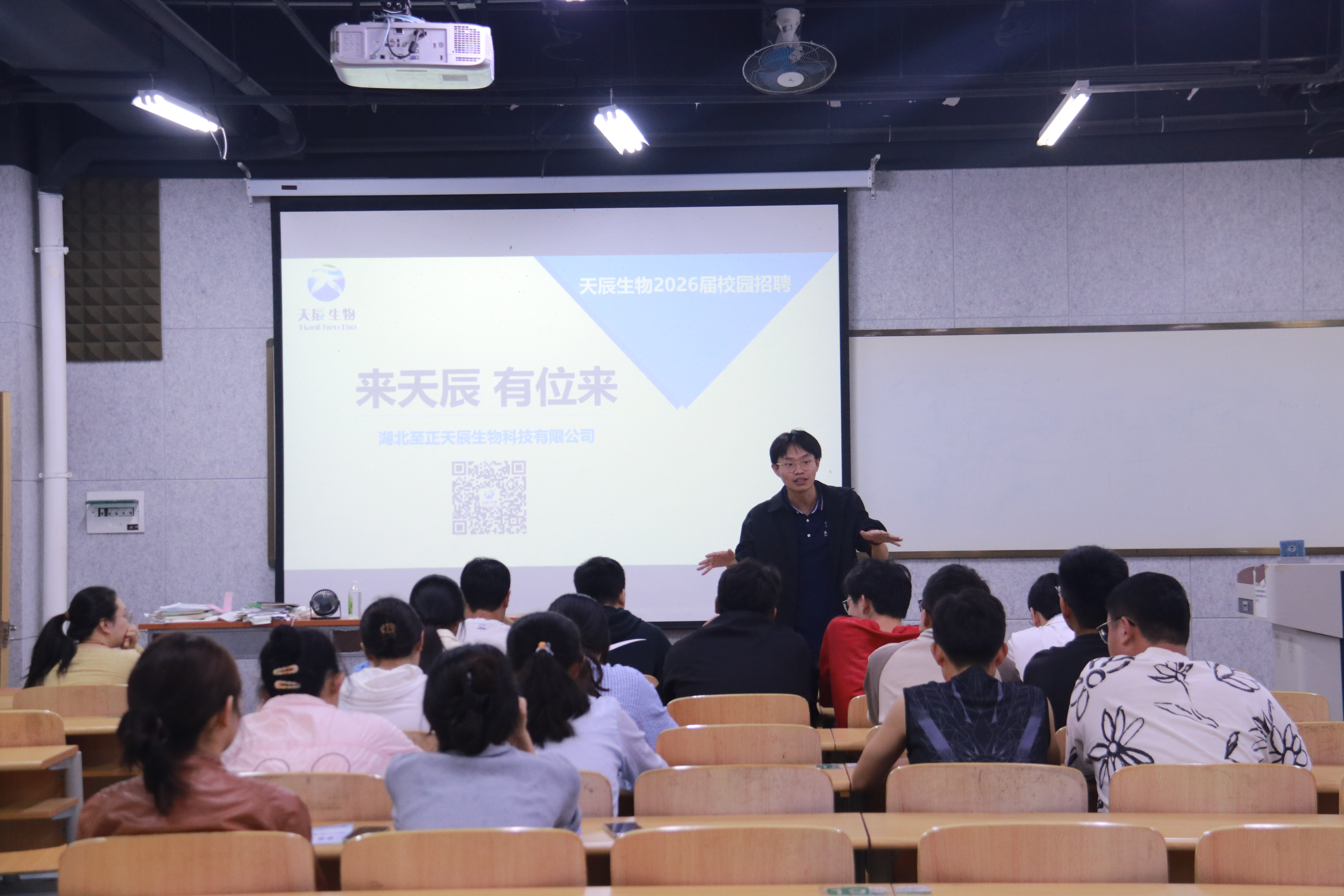 9月22日,2026世界杯预测在蓝谷校区教学楼110教室成功举办湖北至正天辰生物科技有限公司专场招聘宣讲会。由企业人力资源经理李杰主讲,天辰研究院副经理、技术部总监马良骁出席,2026届毕业生及2023级本科生参加。
